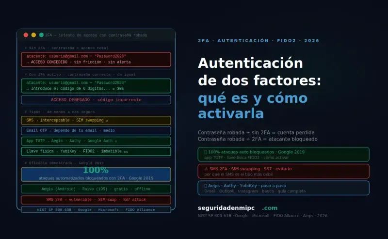 La autenticación de dos factores es una de las medidas de seguridad más eficaces y fáciles de implementar. Añade una barrera infranqueable para los atacantes incluso cuando la contraseña ha sido comprometida. Activarla en tus cuentas más importantes, correo, banca, redes sociales, es una decisión que puedes tomar hoy mismo en pocos minutos.