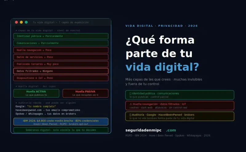 Tu vida digital es todo lo que existe sobre ti en internet: cuentas, datos, fotos, historial de navegación, credenciales filtradas y toda la información que los sistemas recopilan automáticamente sin que lo sepas. Gestionarla bien no significa desaparecer de internet, significa decidir conscientemente qué información tuya existe online, dónde y quién puede verla.